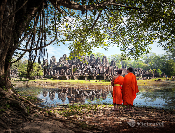 Début de la visite du magnifique site d'Angkor: Angkor Wat qui est le plus important, Angkor Thom, le Bayon, la Terrasse des Éléphants et la Terrasse du Roi Lépreux, le Ta Prohm et le Phnom Bakeng d'où on peut admirer la tour d'Angkor Thom.